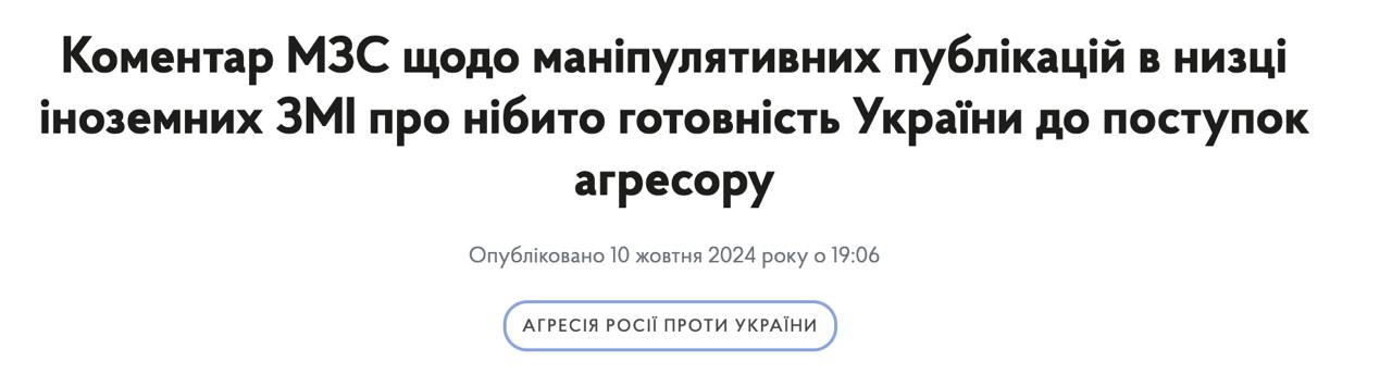 10:27 МИД опубликовал опровержение "манипулятивных утверждений, озвученных в ряде иностранных СМИ" касательно готовности Украины к заморозке войны по линии фронта в обмен на приглашение в НАТО или гарантии безопасности.