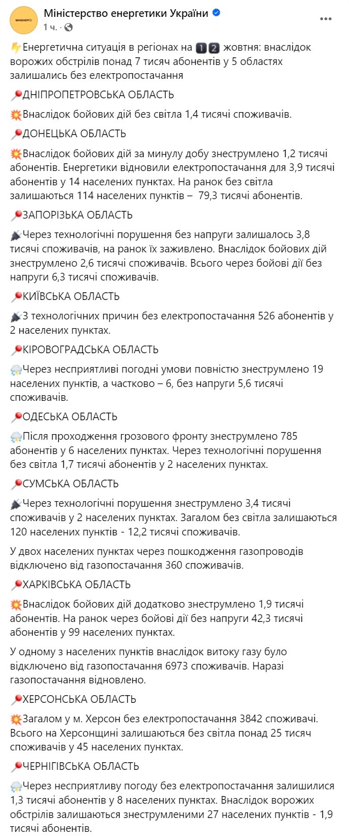 13:36 В результате российских обстрелов более 7 тысяч абонентов в пяти областях оставались без электричества, сообщает Минэнерго.