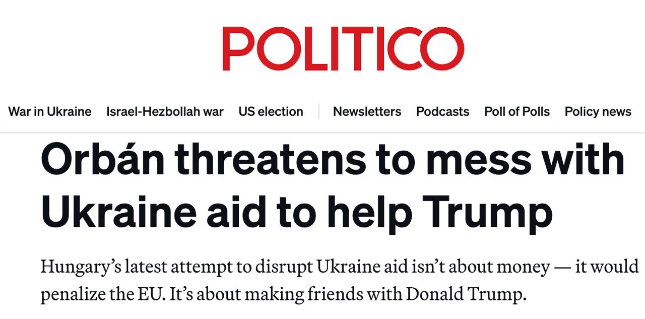 "Орбан придумал способ, как позволить Трампу, если он попадет в Белый дом на второй срок, вывернуться из кредита в $50 млрд. Это позволило бы Трампу соскользнуть с крючка, дав ему возможность сказать республиканским избирателям, что в случае избрания он не даст Украине ни цента", - пишет Politico.