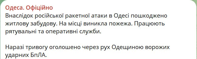 23.51 В результате вечерней ракетной атаки по Одессе повреждения имеются в трех местах, сообщают местные власти: