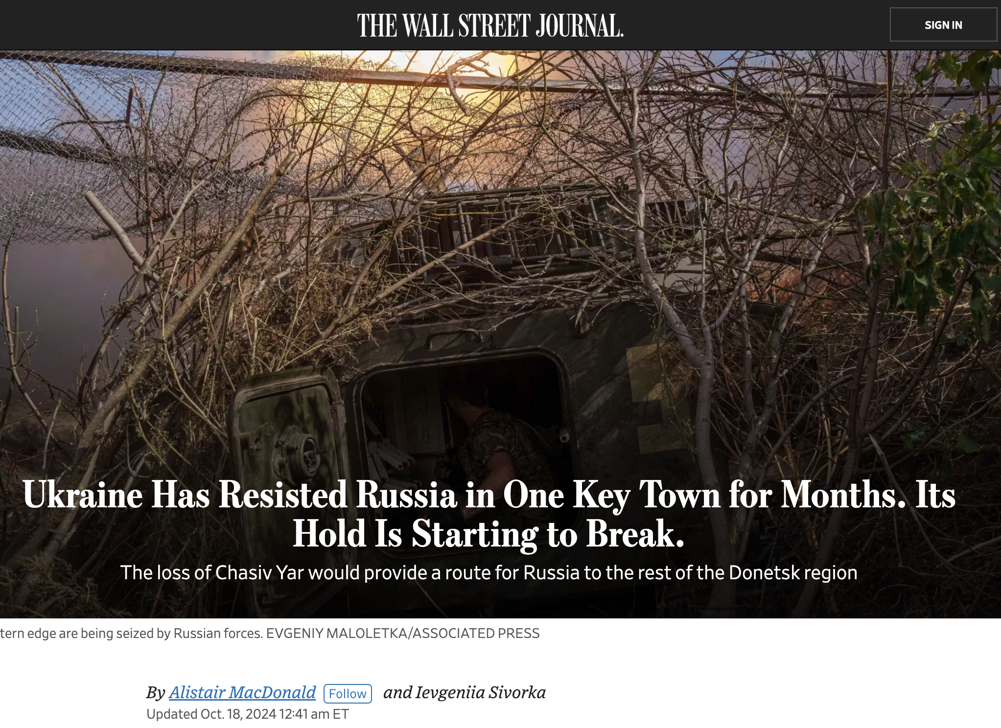 Это продвижение "может означать значительный шаг России к захвату города". А потеря Часова Яра, наряду с Покровском, "является ключевым в попытках Москвы" захватить Донецкую область.
