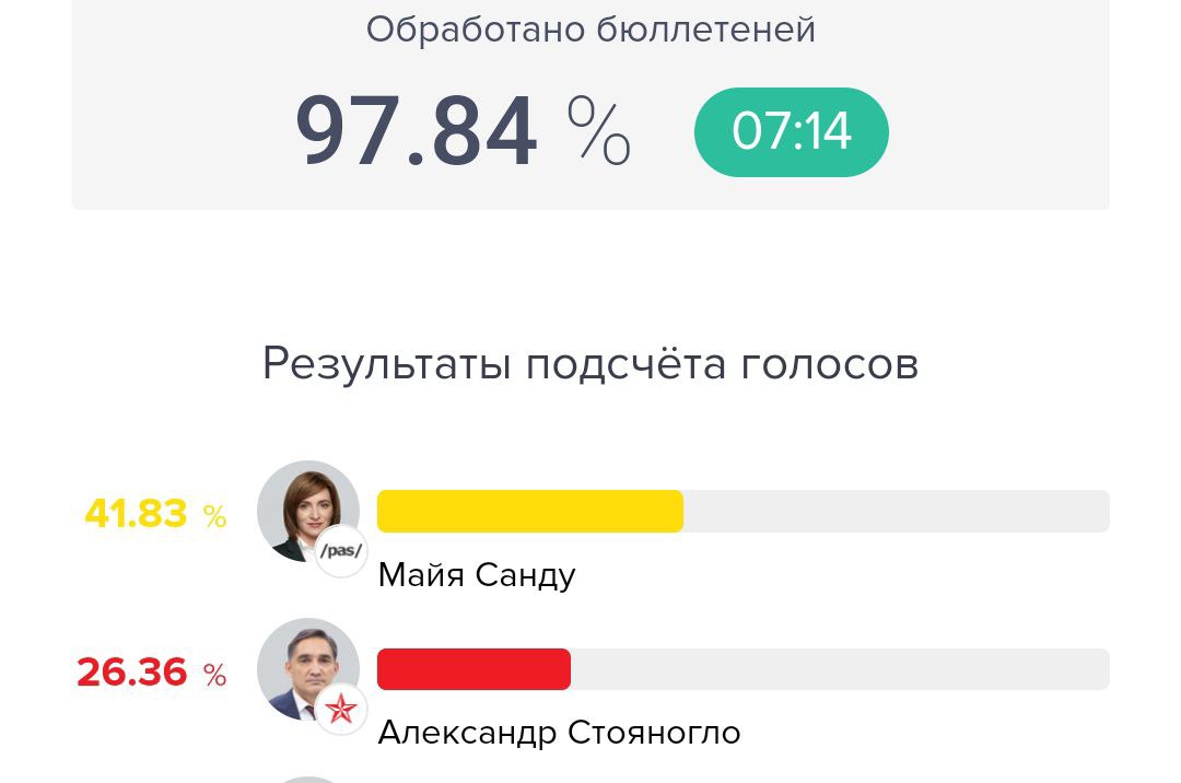 В Молдове по итогам подсчёта почти 98% голосов у действующего президента Майи Санду 41,83%, у ее ближайшего конкурента кандидата от пророссийской Партии социалистов Александра Стояногло - 26,36%.