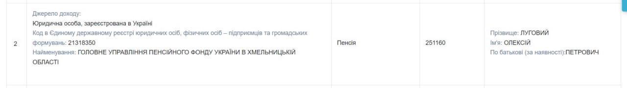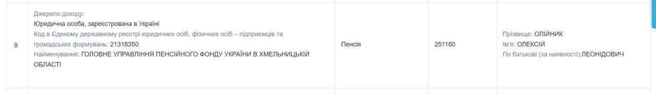 Супруга Алексея Ирина Олейник, которая с 2017 года также работала в прокуратуре Хмельницкой области, пенсию начала получать с 2018-го. Сейчас она указывает местом работы Хмельницкий областной ТЦК. Она также декларировала пенсионные выплаты: в 2023 году — 251,16 тыс. грн, в 2022 году — 238,3 тыс. грн, в 2021 году — 200,5 тыс. грн, 2020 году — 180,9 тыс. грн и т.д. Из деклараций видно получение свыше 1,2 млн грн пенсионных выплат за последние 6 лет. При этом чаще всего не указывается ее зарплата и трудоустройство, зато есть выплаты по рождению детей.