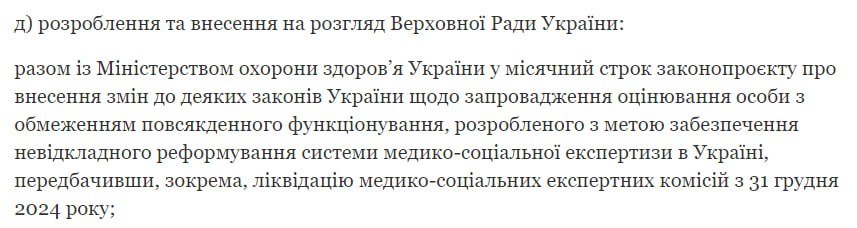 "Вместе с Министерством здравоохранения Украины в месячный срок законопроекта о внесении изменений в некоторые законы Украины о введении оценки лица с ограничением повседневного функционирования, разработанного с целью обеспечения безотлагательного реформирования системы медико-социальной экспертизы в Украине, предусмотрев, в частности, ликвидацию медико-социальных экспертных комиссий с 31 декабря 2024", – дословно говорится в решении СНБО.