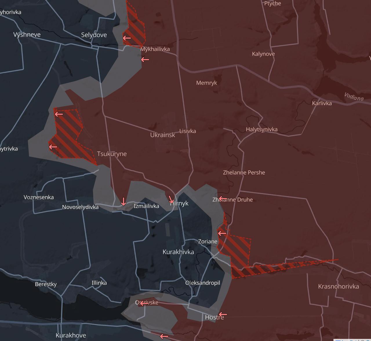 Во-вторых, паблик показал крупные продвижения РФ к западу от Цукурино (в район Новодмитровки), а также к востоку от Курахово, где уменьшилось вклинение ВСУ в российские позиции (район Зоряного).
