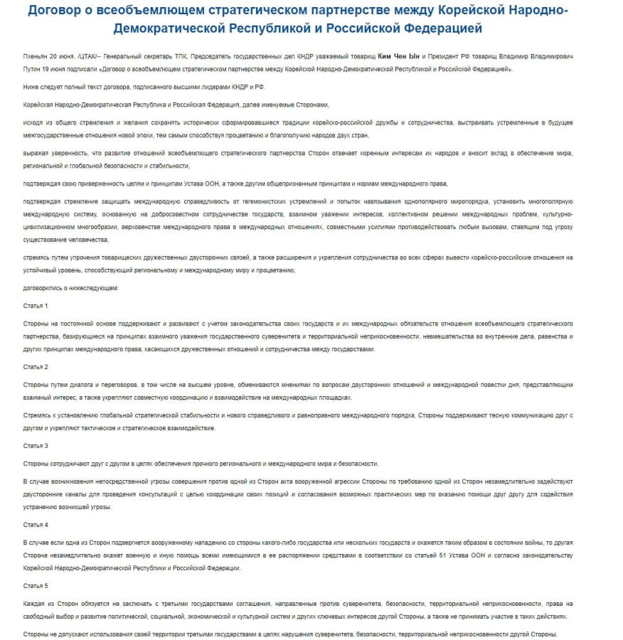 "В случае, если одна из Сторон подвергнется вооруженному нападению со стороны какого-либо государства или нескольких государств и окажется таким образом в состоянии войны, то другая Сторона незамедлительно окажет военную и иную помощь всеми имеющимися в ее распоряжении средствами в соответствии со статьей 51 Устава ООН и согласно законодательству Корейской Народно-Демократической Республики и Российской Федерации", - так дословно гласит 4 статья договора.