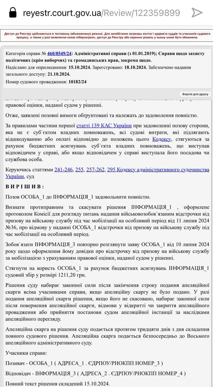 В результате суд отменил решение ТЦК и признал за истцом право на отсрочку от призыва.