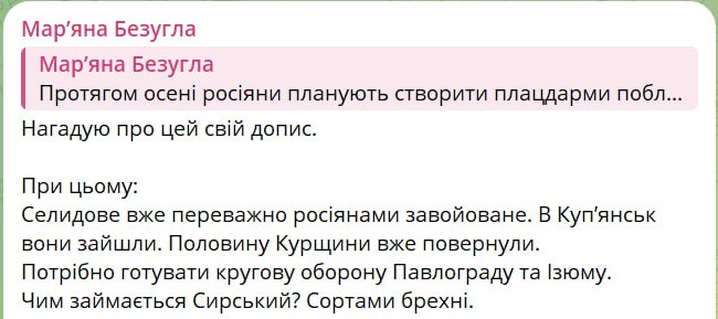 "Селидово уже преимущественно россиянами завоевано. В Купянск они вошли. Половину Курской области уже вернули. Необходимо готовить круговую оборону Павлограда и Изюма", – заявила Безуглая.