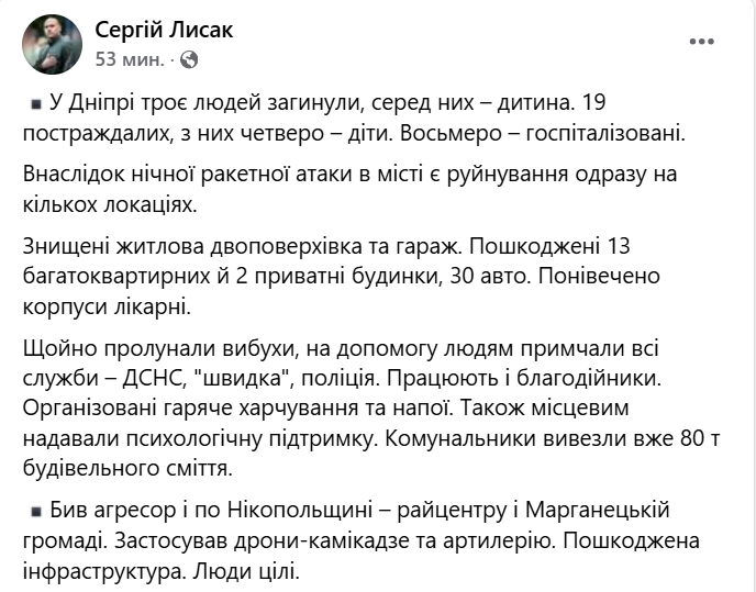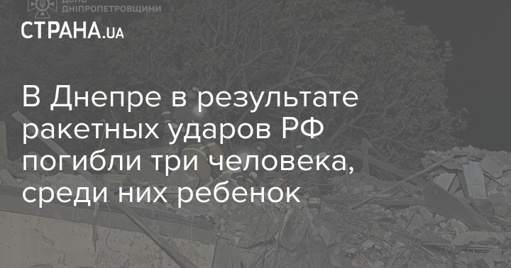 Ночью россияне атаковали город Днепр. Погибли три человека, среди них ребенок. 19 человек пострадали, из них четверо детей. Восемь - госпитализированы.