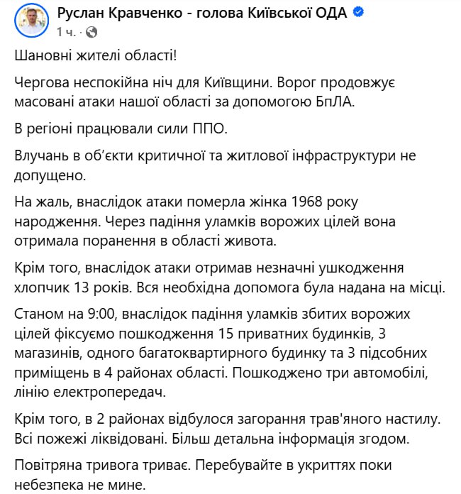 Этой ночью Киевскую область россияне атаковали ударными БПЛА. Погибла женщина. Повреждены жилые дома.