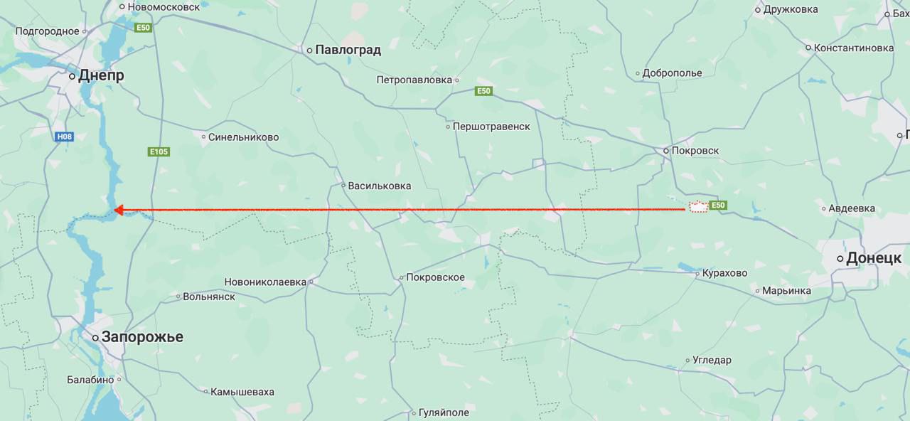 Если провести прямую линию от Селидово к реке Днепр, то там не будет ни одного крупного города. И неизвестно, есть ли там вообще серьёзные укрепления. Это стык Днепропетровской и Запорожской области, и к реке Днепр эта линия подходит к северу от Запорожья и к югу от города Днепр (примерно на полпути между ними).
