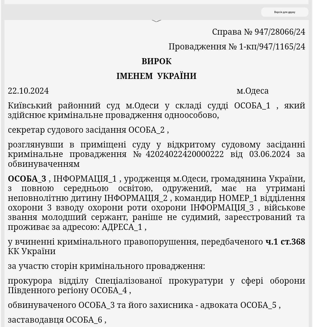 Киевский районный суд Одессы оштрафовал местного сотрудника ТЦК на 80 тысяч гривен за то, что тот требовал с мужчины 4000 долларов за не невручение повестки.