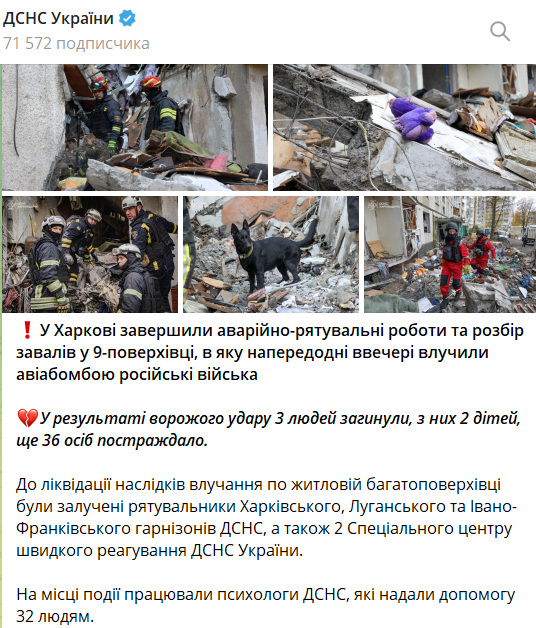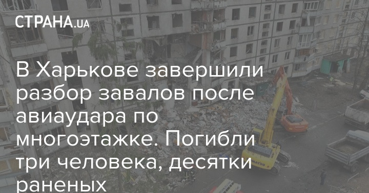В Харькове завершили разбор завалов в многоэтажном жилом доме, в который накануне попала авиабомба. Итоговая цифра - трое погибших, в том числе двое детей. Пострадали 36 человек.