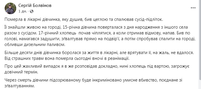 В Харьковской области после истязаний со стороны 17-летнего первокурсника колледжа умерла 15-летняя девочка.