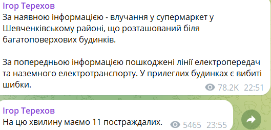 По его словам, предварительно пострадали 11 человек. Зафиксирован прилёт по супермаркету, который расположен возле многоэтажных домов. В домах выбиты стёкла, повреждены электросети.