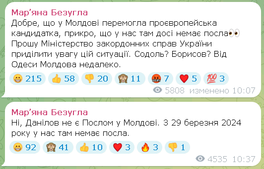 "Хорошо, что в Молдове победила проевропейская кандидатка, досадно, что у нас там до сих пор нет посла. Прошу Министерство иностранных дел Украины уделить внимание этой ситуации. Содоль? Борисов? От Одессы Молдова недалеко. Нет, Данилов не посол в Молдове. С 29 марта 2024 г. у нас там нет посла", - сказано в публикациях Безуглой.