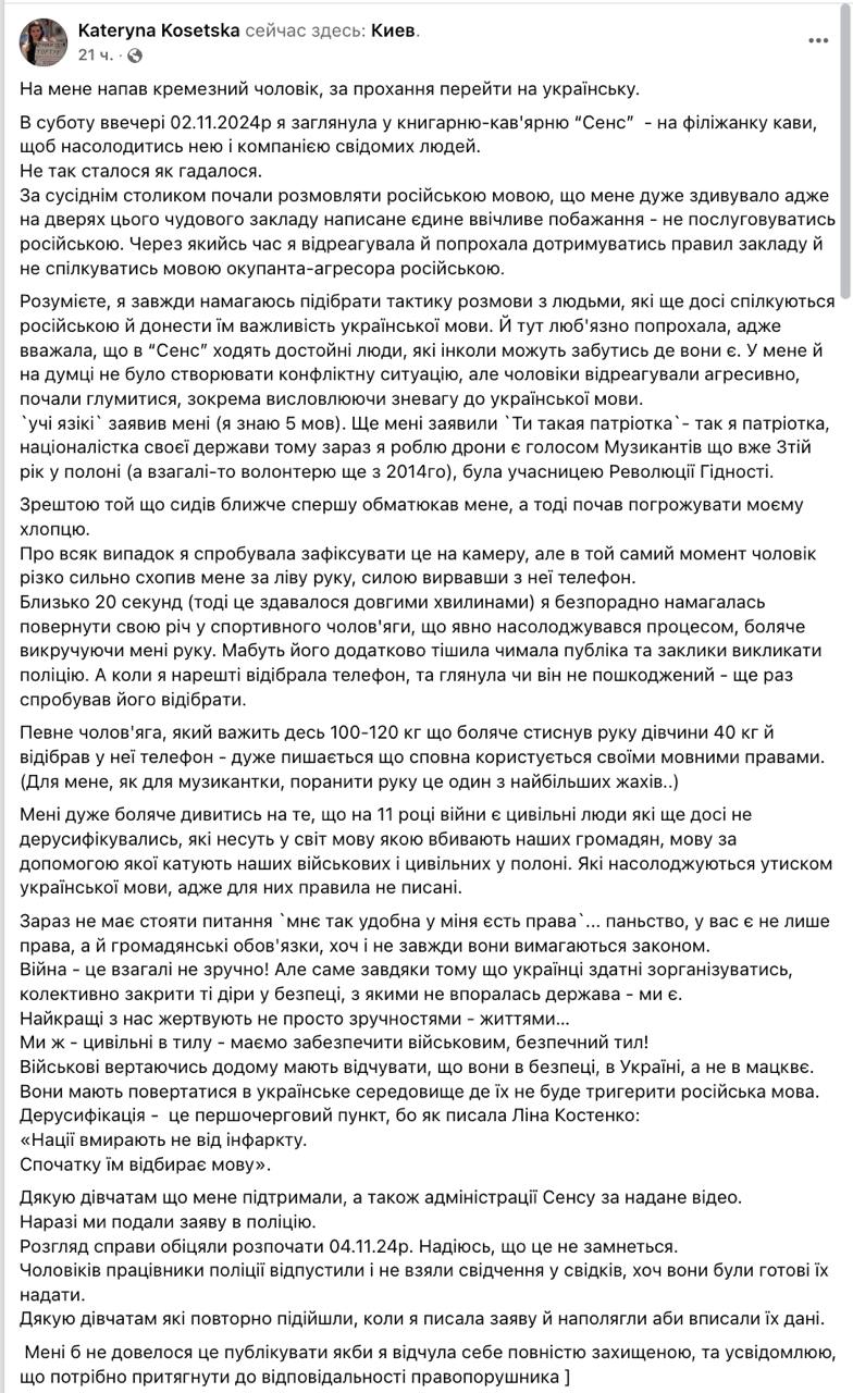 "Но мужчины отреагировали агрессивно, начали глумиться, в частности выражая пренебрежение к украинскому языку. Сидевший ближе сначала обматерил меня, а потом начал угрожать моему парню. На всякий случай я попыталась зафиксировать это на камеру, но в тот же момент мужчина резко сильно схватил меня за левую руку, силой вырвав телефон", - написала Косецкая.