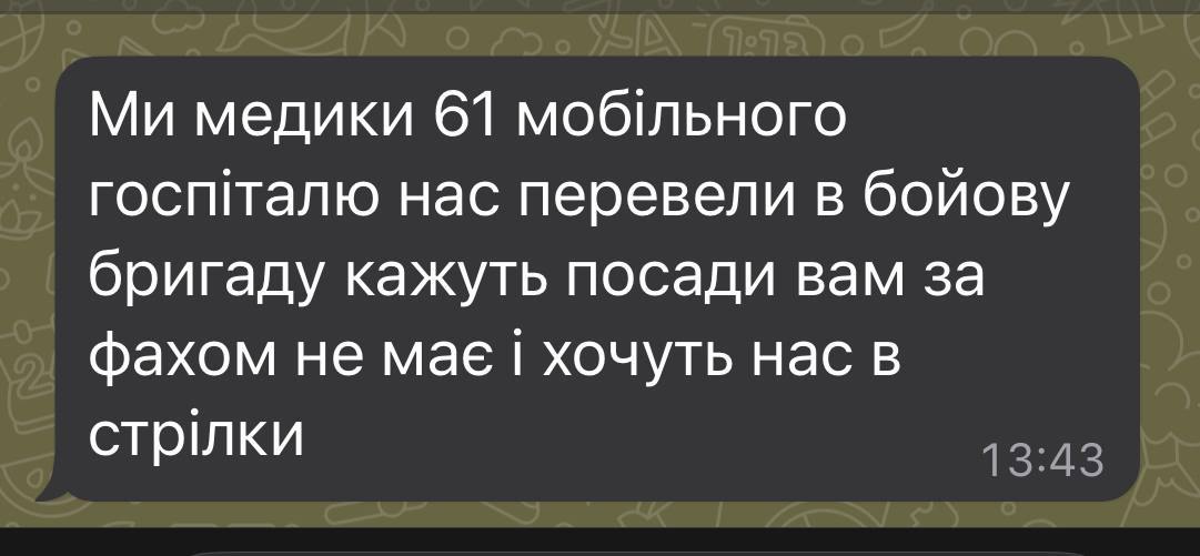 14.51 Перевод боевых медиков и других специалистов, в частности, связистов, в пехоту продолжается. Об этом заявляет нардеп Марьяна Безуглая и публикует соответствующие заявления.