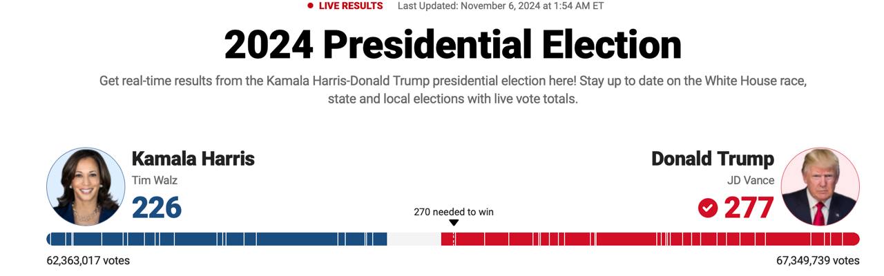 Сообщается, что он набрал 277 голосов выборщиков (при необходимых для победы 270).