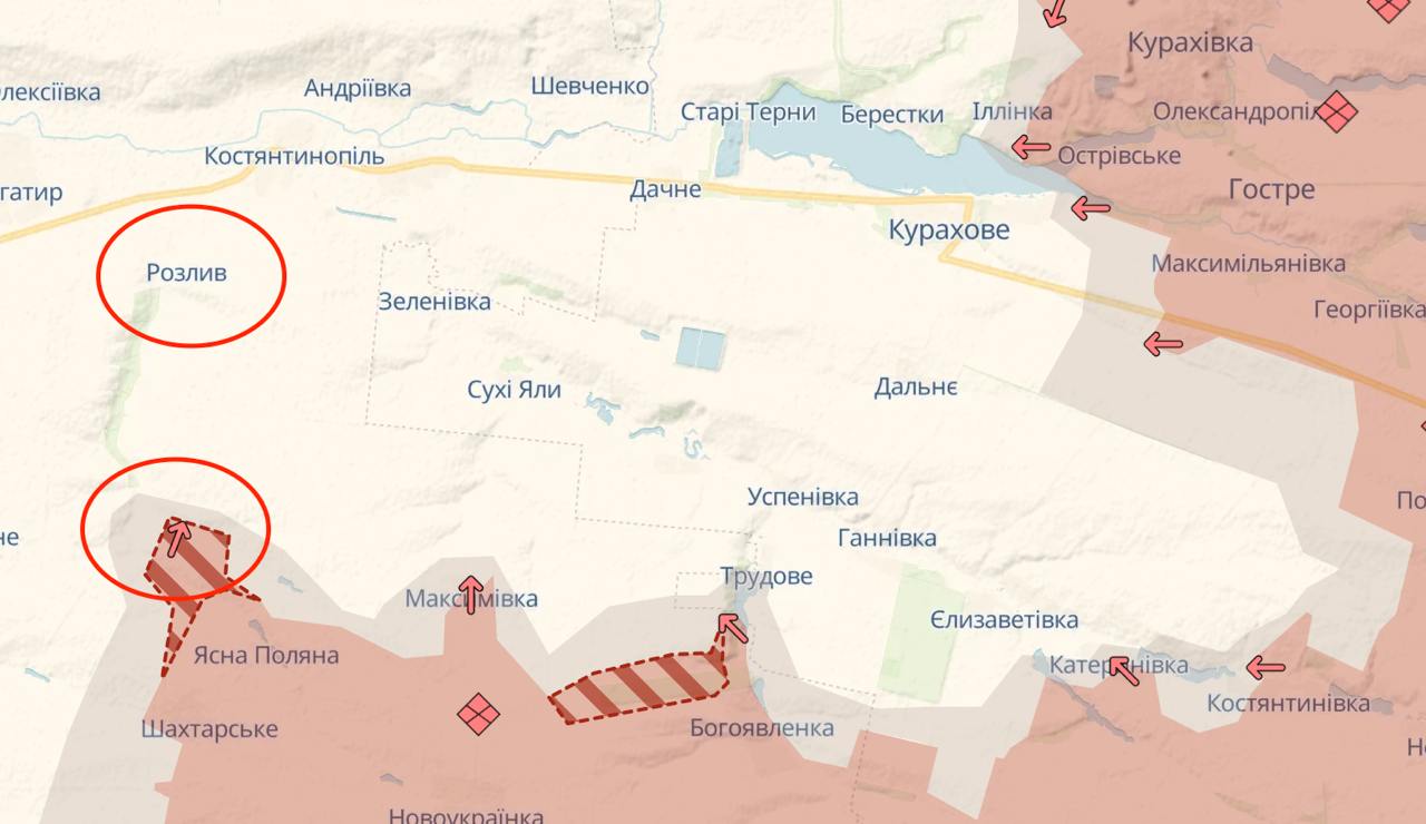 Армия РФ существенно продвинулась со стороны Ясной Поляны к селу Разлив, что возле трассы, ведущий с запада на Курахово, свидетельствует карта Deep State. От позиций РФ до поселка осталось меньше 6 км. Также у РФ есть продвижение восточнее, возле Богоявленки.