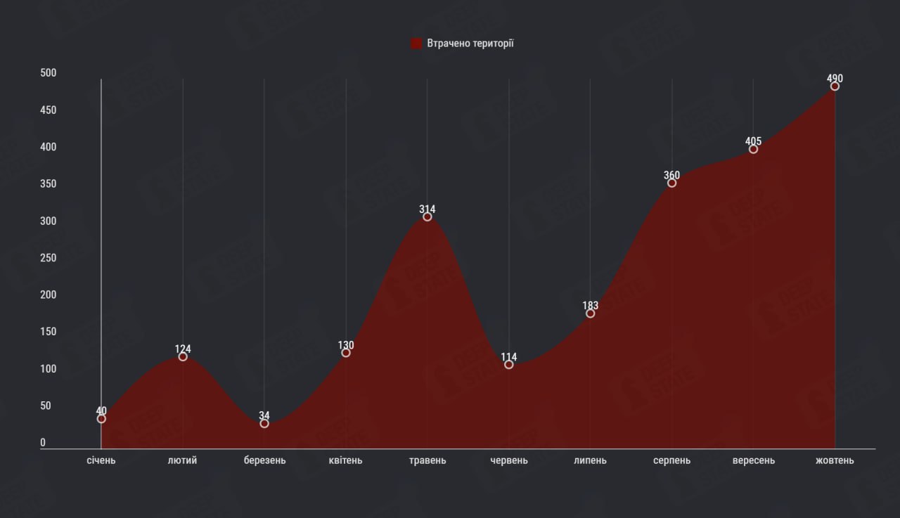 За октябрь армия РФ захватила около 490 кв. км территорий Украины, сообщает Deep State. Это самый большой показатель в этом году и с начала российской наступательной операции, которая началась в октябре 2023 года.