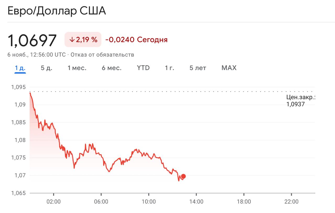 Между тем на фоне новости о победе Трампа евро начал падать к доллару. Курс составляет уже 1,0697.