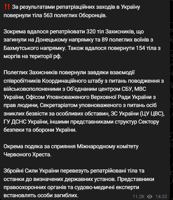 В Украину вернули тела 563 погибших военных по результатам репатриационных мероприятий. 320 погибли на Донецком направлении, 89 - на Бахмутском. Еще 154 тела находились в моргах РФ.