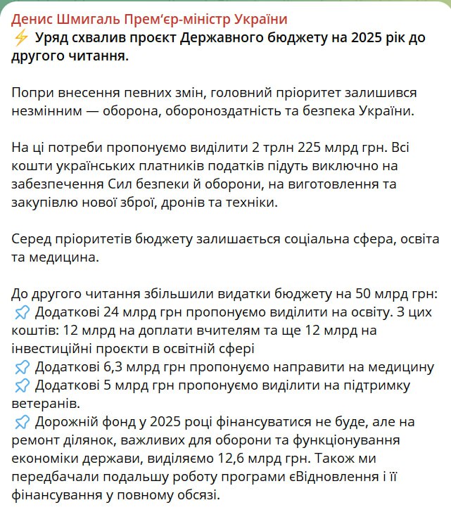 По его словам, приоритет в документе отдан обороне: на эти нужды предлагается выделить 2 трлн 225 млрд гривен. Все средства украинских налогоплательщиков пойдут на обеспечение сил безопасности и обороны, на изготовление и закупку нового оружия, дронов и техники.