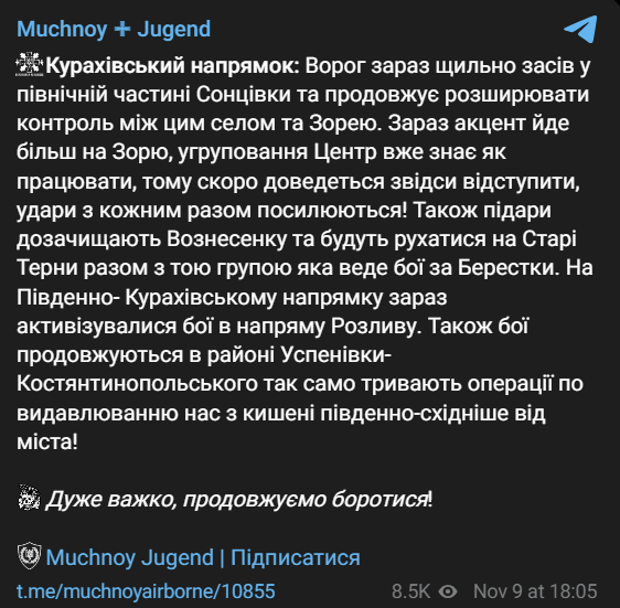 Украинский военный с позывным "Мучной" сообщает, что россияне расширяют контроль между Сонцовкой и соседней Зарей, откуда "скоро придется отступить, удары с каждым разом усиливаются".