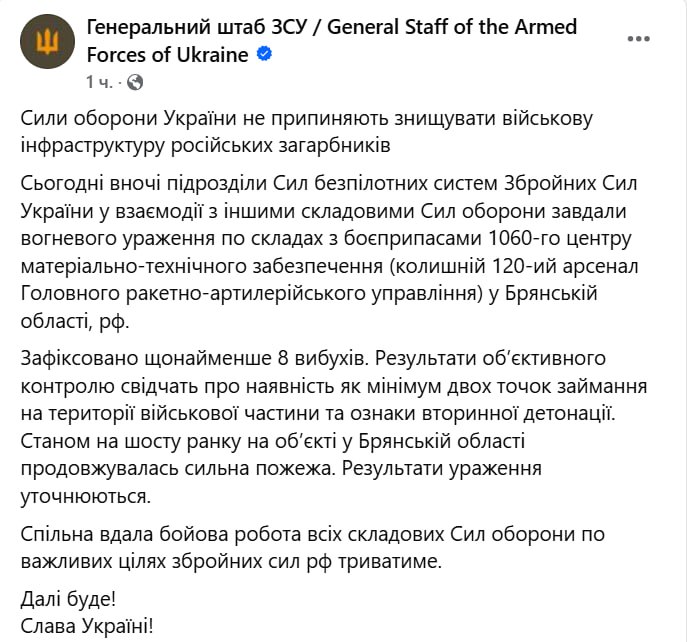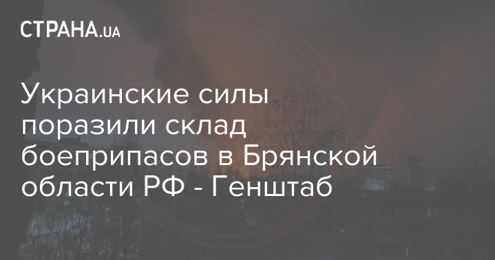 Сегодня ночью силы обороны Украины поразили склад боеприпасов в Брянской области РФ. Об этом сообщает Генштаб ВСУ.