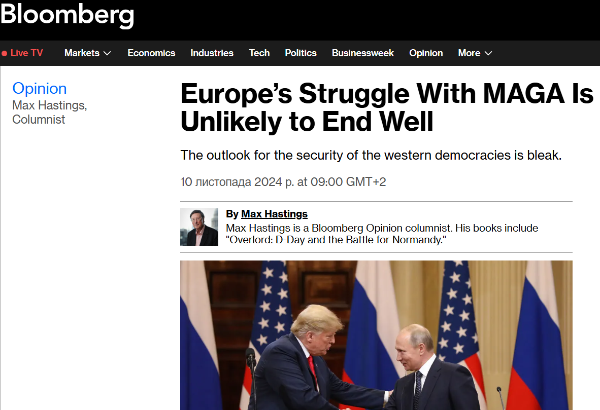 "Что касается европейской поддержки Украины, я много раз писал, что без США дело нации президента Владимира Зеленского было бы обречено. И так оно теперь и есть. Даже если военная помощь Киеву не будет немедленно прекращена, воля украинцев к сопротивлению русским тает по мере того как тает воля Запада вооружить их. Победа Трампа почти наверняка означает их поражение", - пишет он.