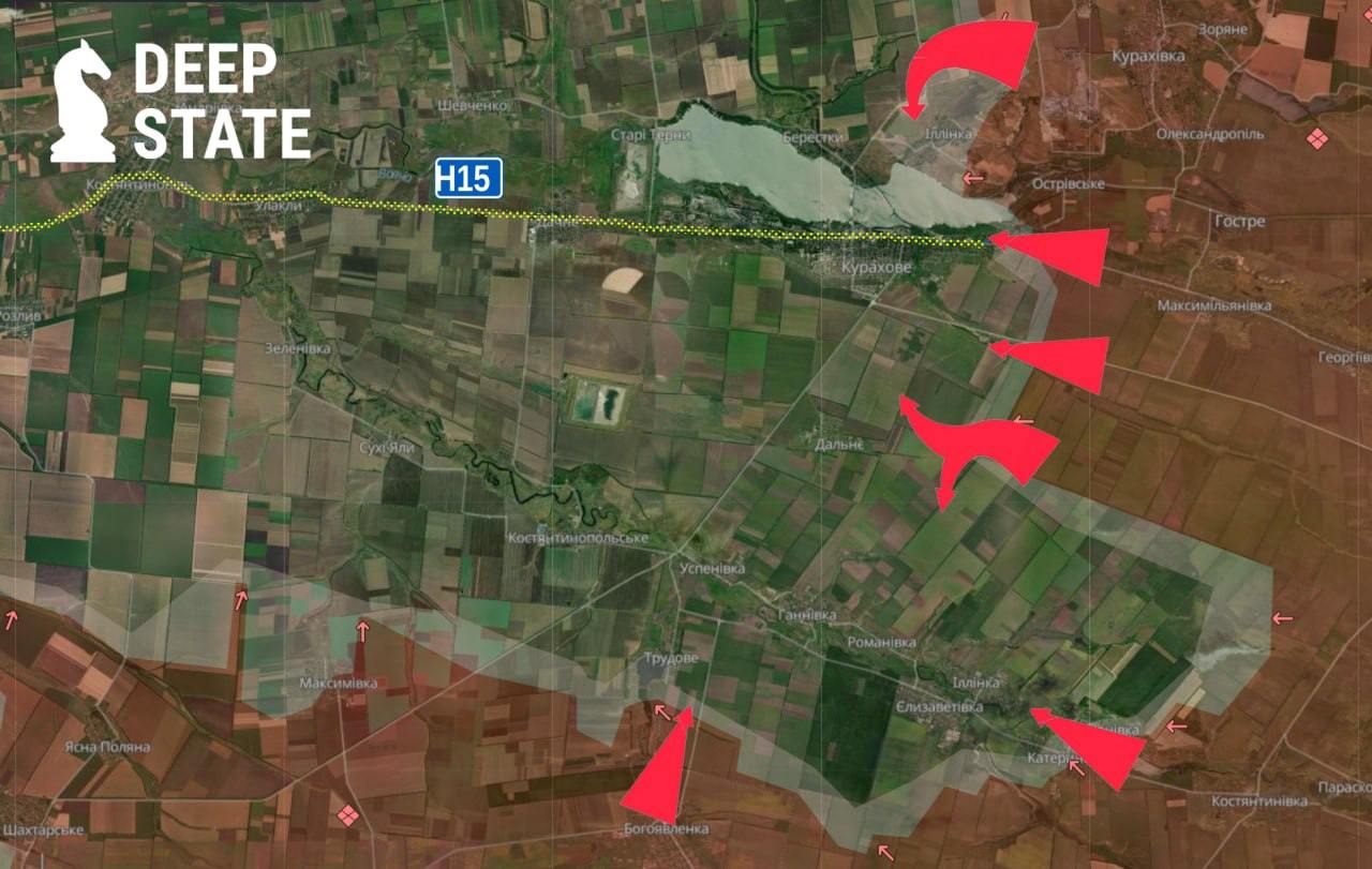 С севера они уже заходили в Сонцовку, но пока не закрепились (украинские военные при этом утверждают обратное), параллельно атакуют Берестки и Старые Терны. С юга до трассы им остается около 10 км, а оборонные укрепления ВСУ там "оставляют желать лучшего". С востока они заходят на окраины Курахово, пытаются закрепиться и накопить силы.