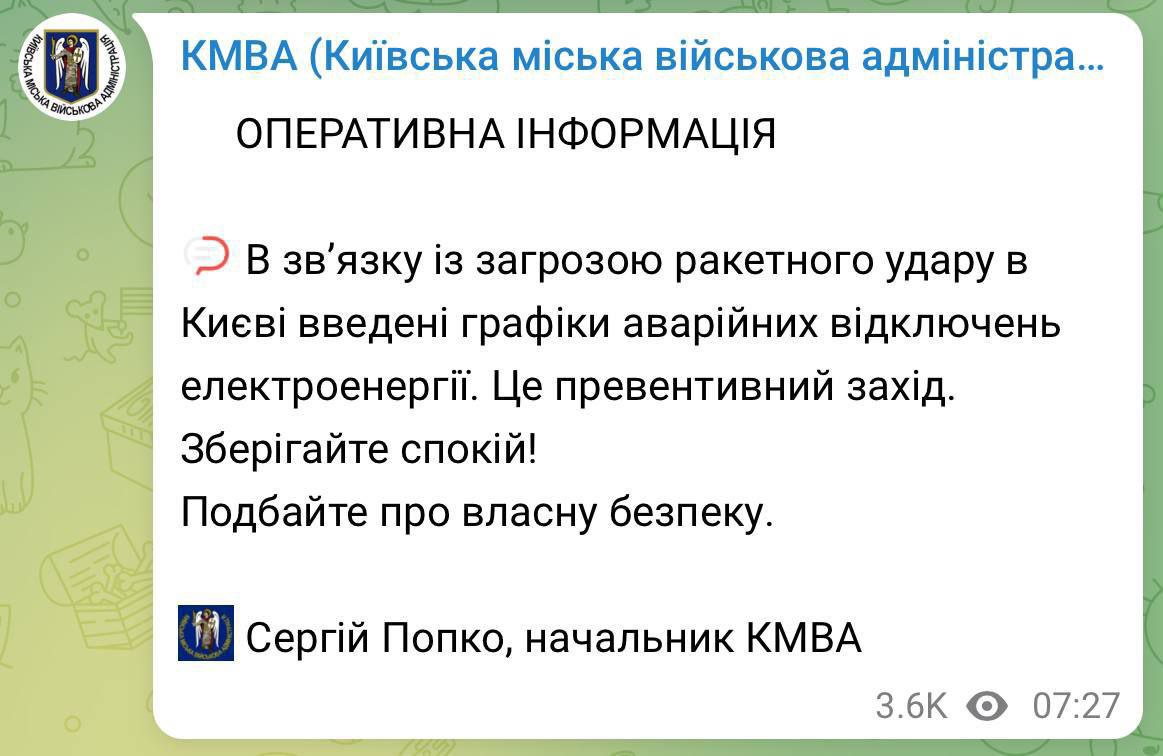 7.39 В Киеве превентивно ввели экстренные отключения света - на случай ракетного удара по энергетике.