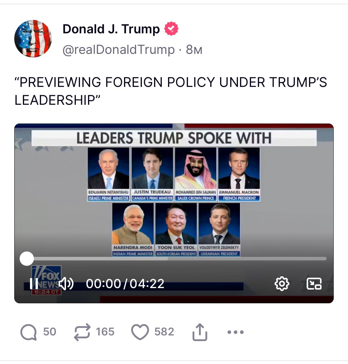 Победивший на выборах президента США Дональд Трамп разместил у себя в сети Truth Social сюжет FoxNews о своих разговорах с мировыми лидерами, проведенными уже после избрания, в котором нет упоминания о главе Кремля Владимире Путине.
