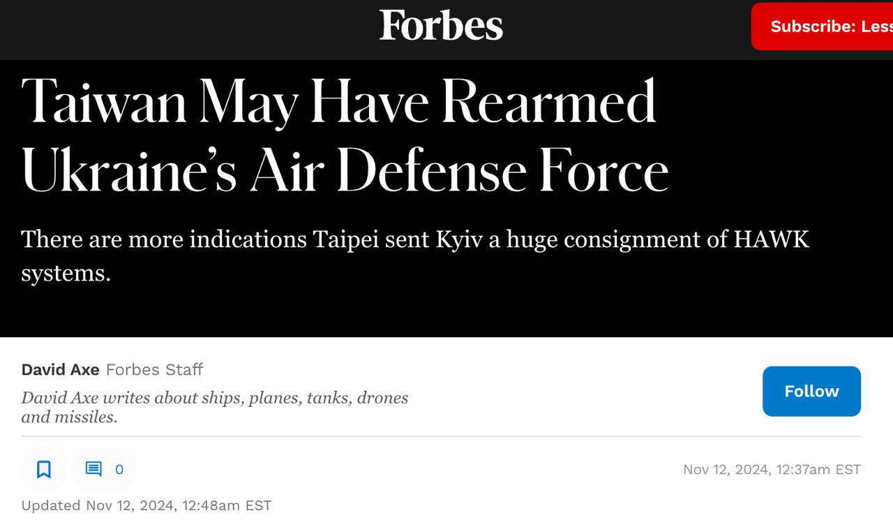 Тайвань передал Украине американские зенитно-ракетные комплексы (ЗРК) среднего радиуса действия HAWK. ВСУ могли получить до 15 таких батарей, и теперь они составляют около трети украинской ПВО.
