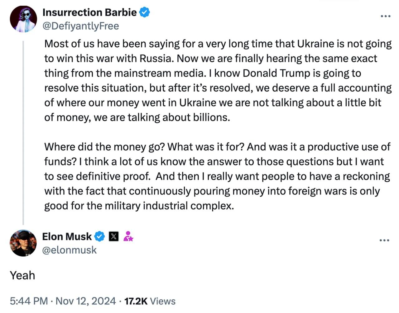 Об этом бизнесмен написал в соцсети X, комментируя пост блогера, которая задаётся вопросом, куда ушли миллиарды долларов, которые потратили на Украину.