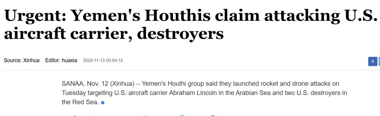 Йеменские хуситы заявили об ударах по авианосцу и двум эсминцам США в Аравийском и Красном морях