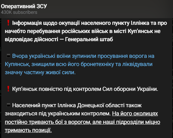 "Вчера украинские воины остановили продвижение врага на Купянск, уничтожили всю его бронетехнику и ликвидировали значительную часть живой силы. Купянск полностью под контролем Сил обороны Украины.