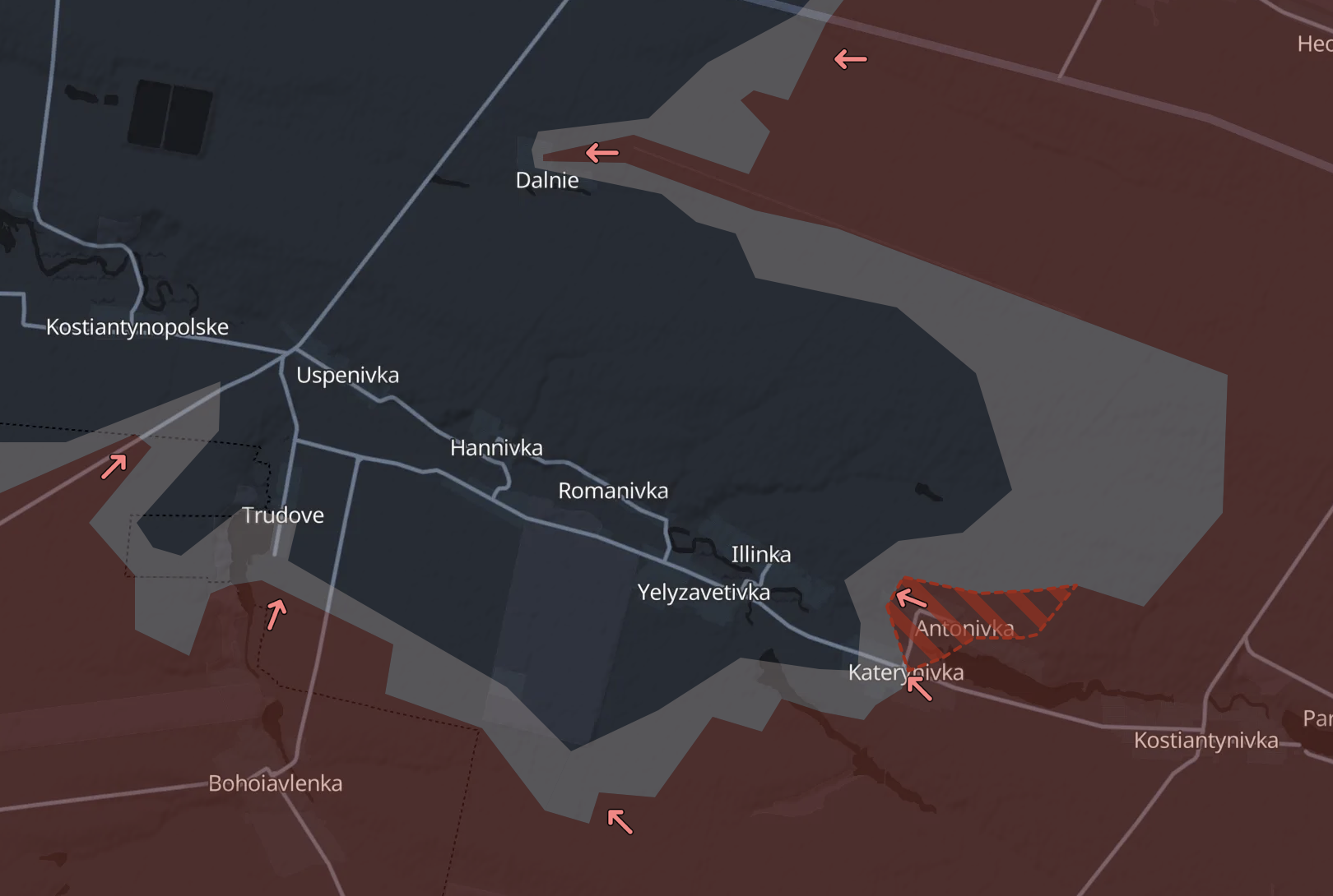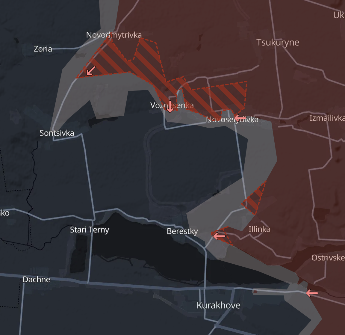 К северу от города они продвинулись от Сонцовки до Новоселидовки, к востоку - в районе Берестков, а к юго-востоку - в Екатериновке и Антоновке, согласно карте мониторингового сервиса Deep State.