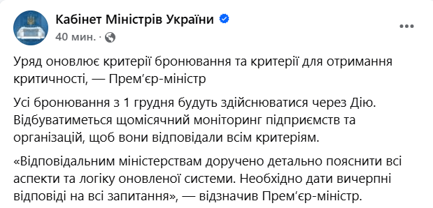 Бронирование работников вернется с 1 декабря и будет осуществляться только через "Дию". Об этом сообщает Кабинет министров по итогам аудита предприятий и организаций, имеющих статус критических и право на бронь.