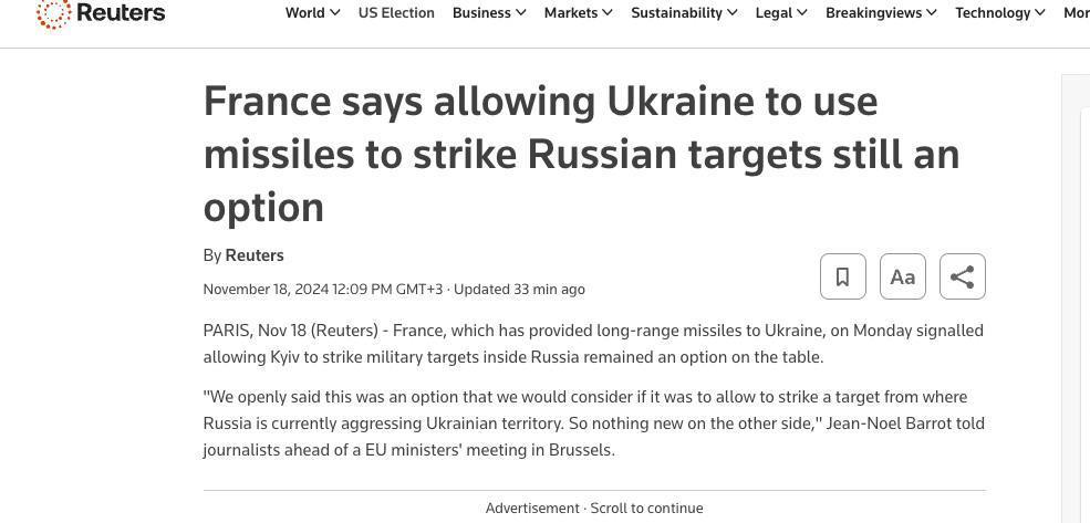 Между тем издание Le Figaro удалило информацию о разрешении властей Великобритании и Франции бить по России дальнобойными ракетами Storm Shadow. Такую новость французская газета распространила вчера после сообщений о снятии Байденом запрета на удары дальнобойными ракетами ATACMS по РФ. Но сейчас статью на сайте издания отредактировали, убрав оттуда отрывок о Storm Shadow.