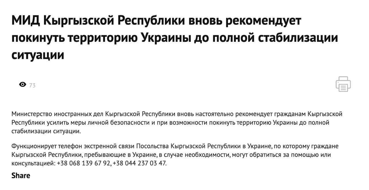 Посольство Казахстана призвало своих граждан не приближаться к прифронтовым районам и по возможности вообще покинуть Украину "в связи с увеличением артиллерийских обстрелов и авиаударов".