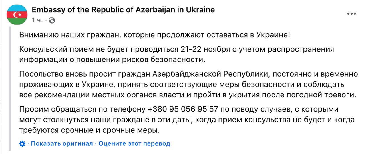 Посольство Азербайджана написало, что 21 и 22 ноября консульский прием проводиться не будет из-за повышения рисков безопасности.