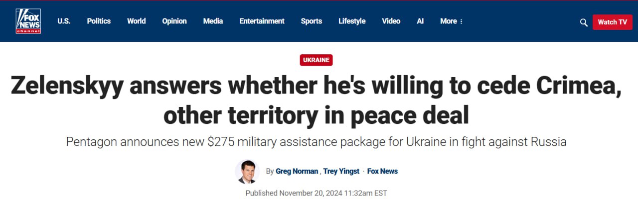 Ранее в том же интервью Зеленский заявил, что Украина продолжит сражаться и без поддержки США, но в конечном итоге проиграет войну, если США прекратят свое военное финансирование.