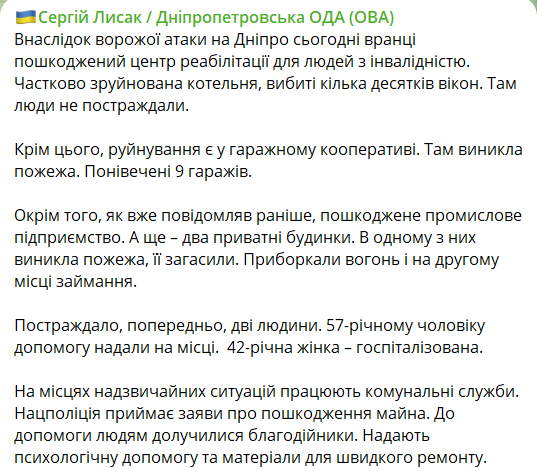 Глава Днепропетровской ОВА Сергей Лысак сообщил, что в результате удара РФ пострадали два человека. Поврежден центр реабилитации для людей с инвалидностью, горел гаражный кооператив, повреждено промышленное предприятие и два частных дома.