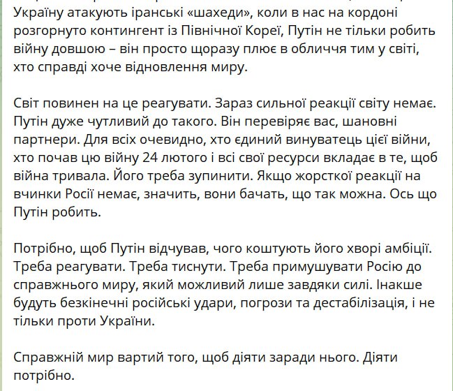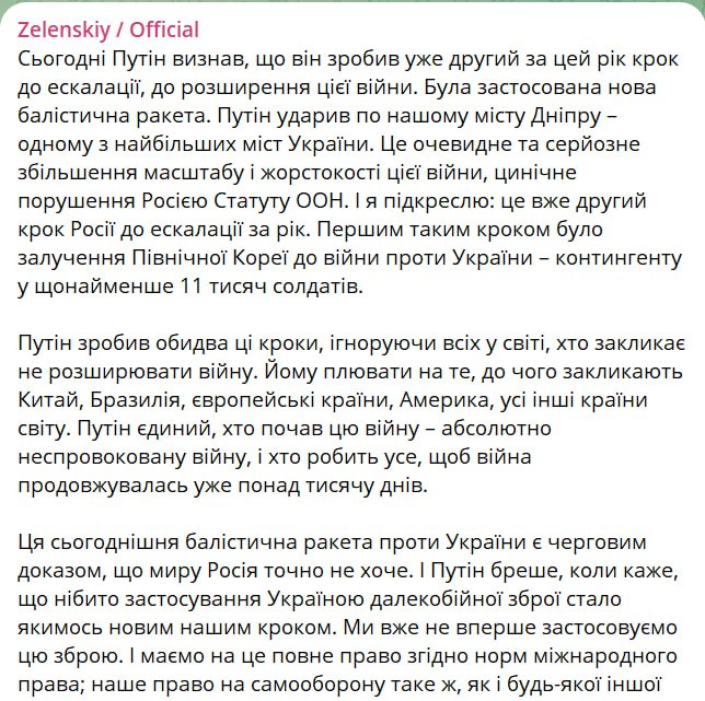 "Сегодня Путин признал, что он сделал уже второй за этот год шаг к эскалации, расширению этой войны. Была применена новая баллистическая ракета. Путин ударил по нашему городу Днепру – одному из самых больших городов Украины. Это очевидное и серьезное увеличение масштаба и жестокости этой войны, циничное нарушение Россией Устава ООН. И я подчеркну: это уже второй шаг России к эскалации через год. Первым таким шагом было привлечение Северной Кореи к войне против Украины – контингента, по меньшей мере, в 11 тысяч солдат", - сказано в публикации.