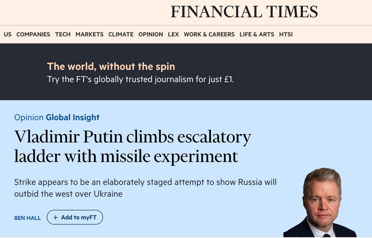 Вчерашний пуск новой российской ракеты по Днепру был "прежде всего предупреждением". Так считает редактор Financial Times по Европе Бен Холл.