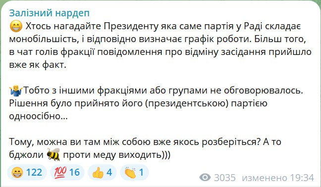 "Напомните президенту, какая именно партия в Раде составляет монобольшинство, и, соответственно, определяет график работы. Более того, в чат глав фракций сообщение об отмене заседания пришло уже как факт", – написал он.