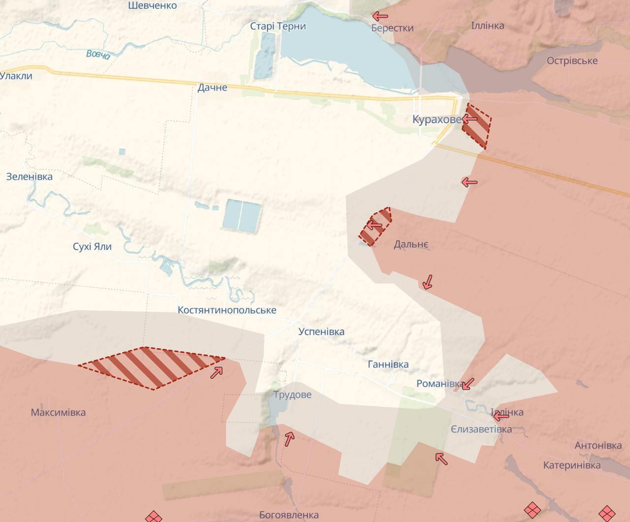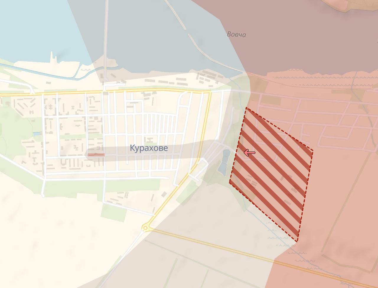 Судя по ней, россияне штурмовали одну улицу, но закрепиться в центре им не удалось. Однако у них есть продвижение южнее города - возле Дальнего и Максимовки.