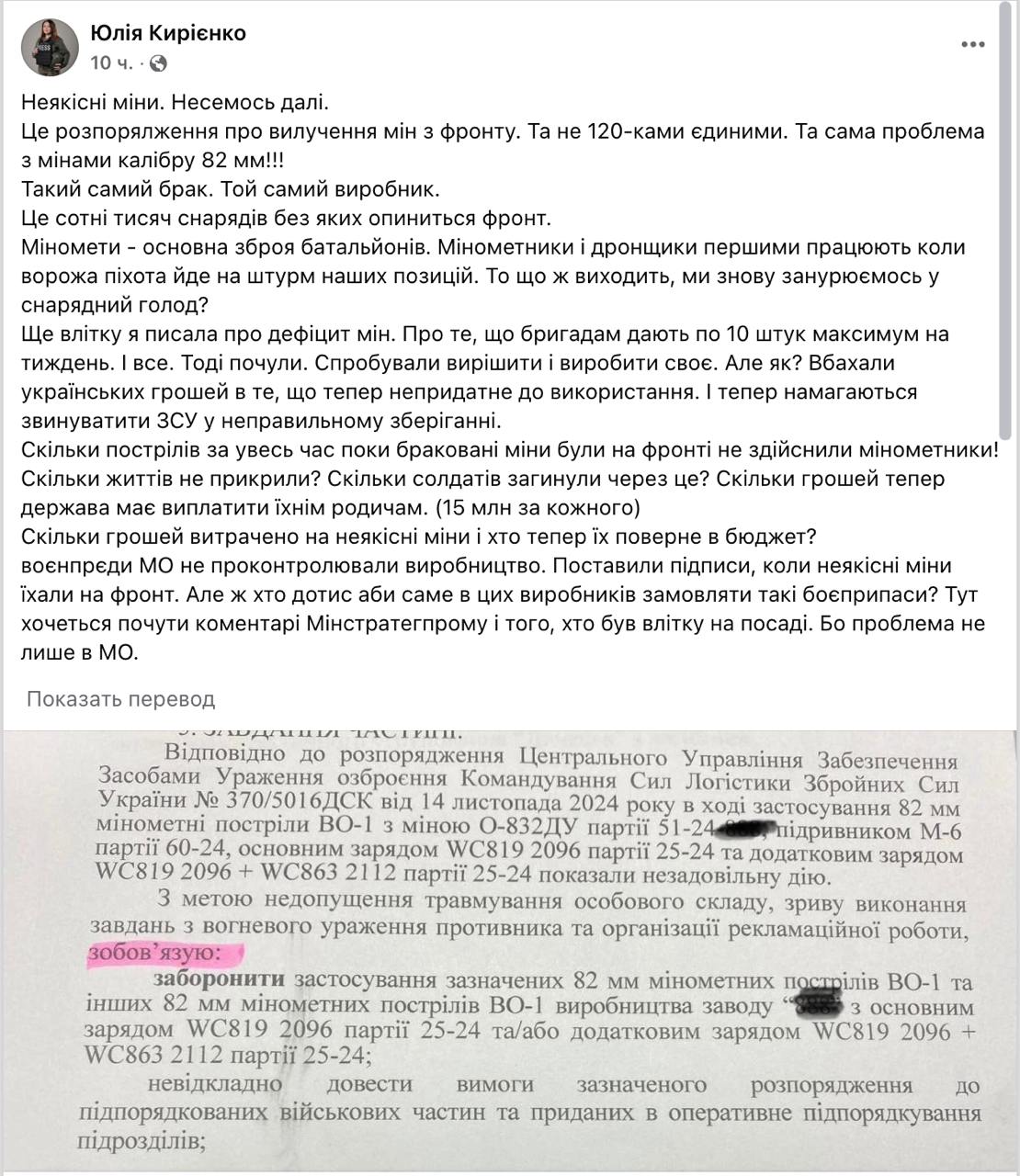 "Это распоряжение об изъятии мин с фронта. Да, не 120-миллимитровками едиными. Та же проблема с минами калибра 82 мм! Такой же брак. Тот же производитель (то есть "Укрборонпром" - Ред.). Это сотни тысяч снарядов, без которых окажется фронт. Минометы – основное оружие батальонов. Минометчики и дронщики первыми работают, когда вражеская пехота идет на штурм наших позиций. Так что же, значит, мы снова погружаемся в снарядный голод?" - написала корреспондент.